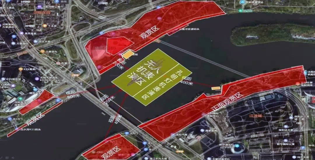 無人機表演位置位于盛京大劇院南側河面上空,渾河兩岸均可觀賞。根據(jù)無人機空中圖像位置和高度,建議觀賞區(qū)域如下:1. 渾河南岸由渾河大橋以東至南洋碼頭區(qū)間;2. 渾河北岸由渾河大橋以東至秦開像南面的觀景臺區(qū)間;3. 渾河大橋以西南北兩岸距渾河大橋500米以內(nèi)區(qū)間。